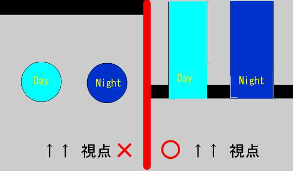 ところが実際は、暗幕はもっと手前でおっさんの形にくり抜かれている状態でした。そしてくり抜かれた向こうに、昼と夜の風景が覗けるという形式だったんですね(同右)。